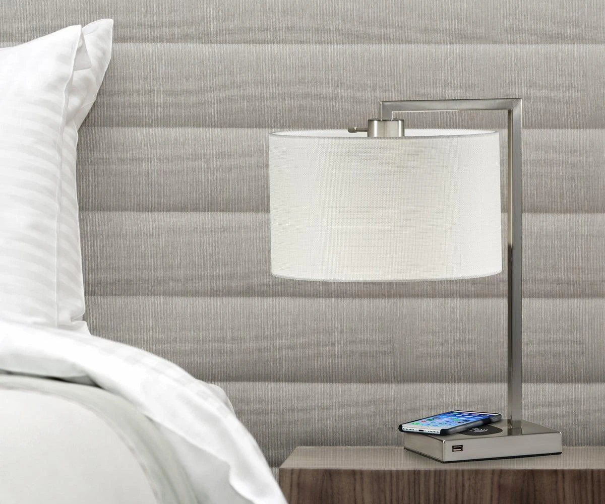 The Addison Table Lamp combines classic mid-century looks with easy modern functionality. The unique design of the lamp stem creates an eye-catching angular style which seems to elegantly suspend the round fabric shade. The sturdy base of this lamp serves to anchor this piece while acting as a convenient phone-charging station. Add the Addison Table Lamp to your space and enjoy the way it warmly illuminates surfaces and dark corners alike.