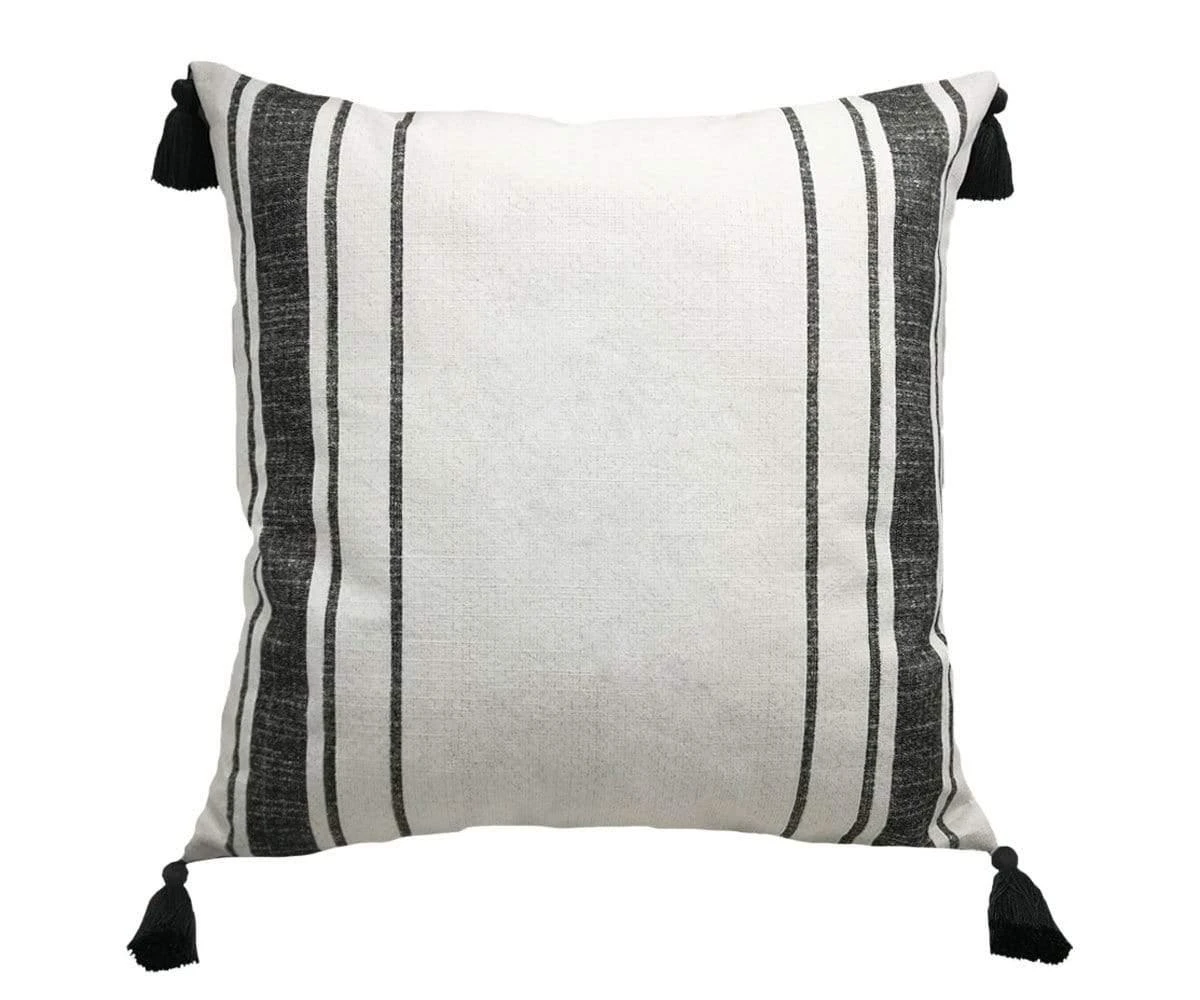 The Breezy Stripes Pillow features embroidered black stripes on a neutral cotton background. This pillow combines the textures of detailed embroidery with those of the supple linen in a uniquely lovely way, adding an airy sense of light, contemporary style to any space. Completed by an invisible zipper closure and a set of breezy, stylish tassels, this pillow is an incredibly versatile accent to add to any room. Layer this pillow with other throw pillows to complete your modern decor in style – this piece effortlessly brings both texture and dimension to any sofa, accent chair or bed where it is placed. Made of a cotton-canvas blend, this pillow offers durability of while retaining a luxurious feel. Note: pillow insert is sold separately.