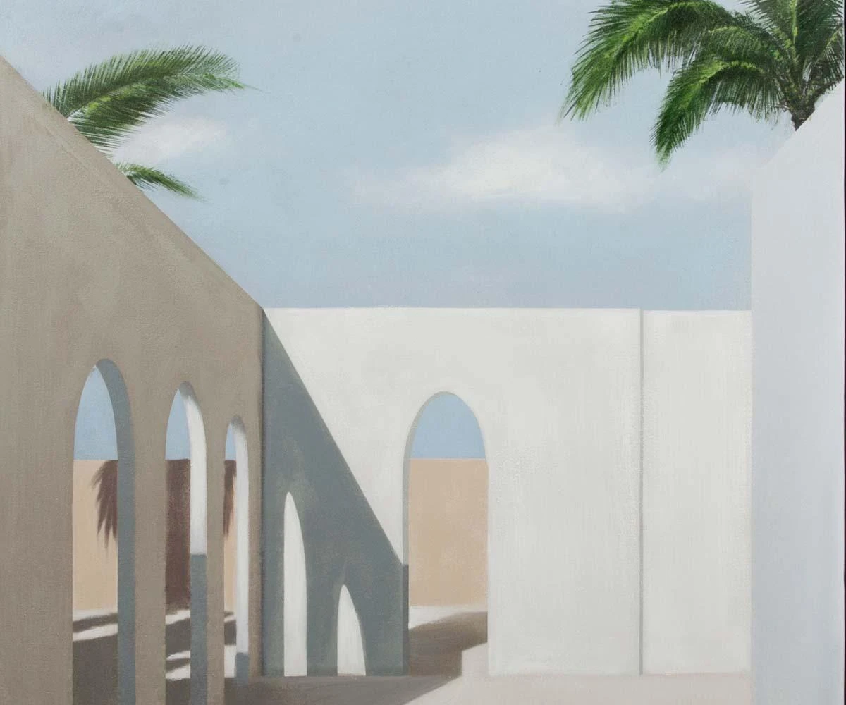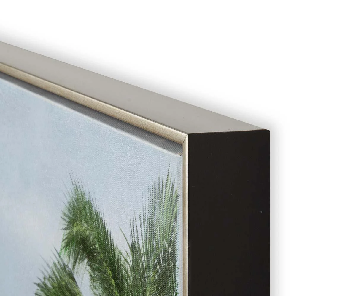The Distant Escape I Oil Painting fills your home with the ambiance of faraway lands. Depicting a sunny cityscape punctuated with emerald palm trees, this piece captures the essence of tropical getaways filled with warm summer breezes and cool dips into a sparkling cerulean sea. Hand-painted with 100% oil paint on canvas, this piece is finished with a modern silver and black frame. The clean architectural motif of this contemporary painting can easily blend with any number of decor styles. Pair this piece with the Distant Escape II Oil Painting to sate your feelings of wanderlust and bring a sense of sun-drenched tropical escape to your home. Distant Escape II Oil Painting sold separately.