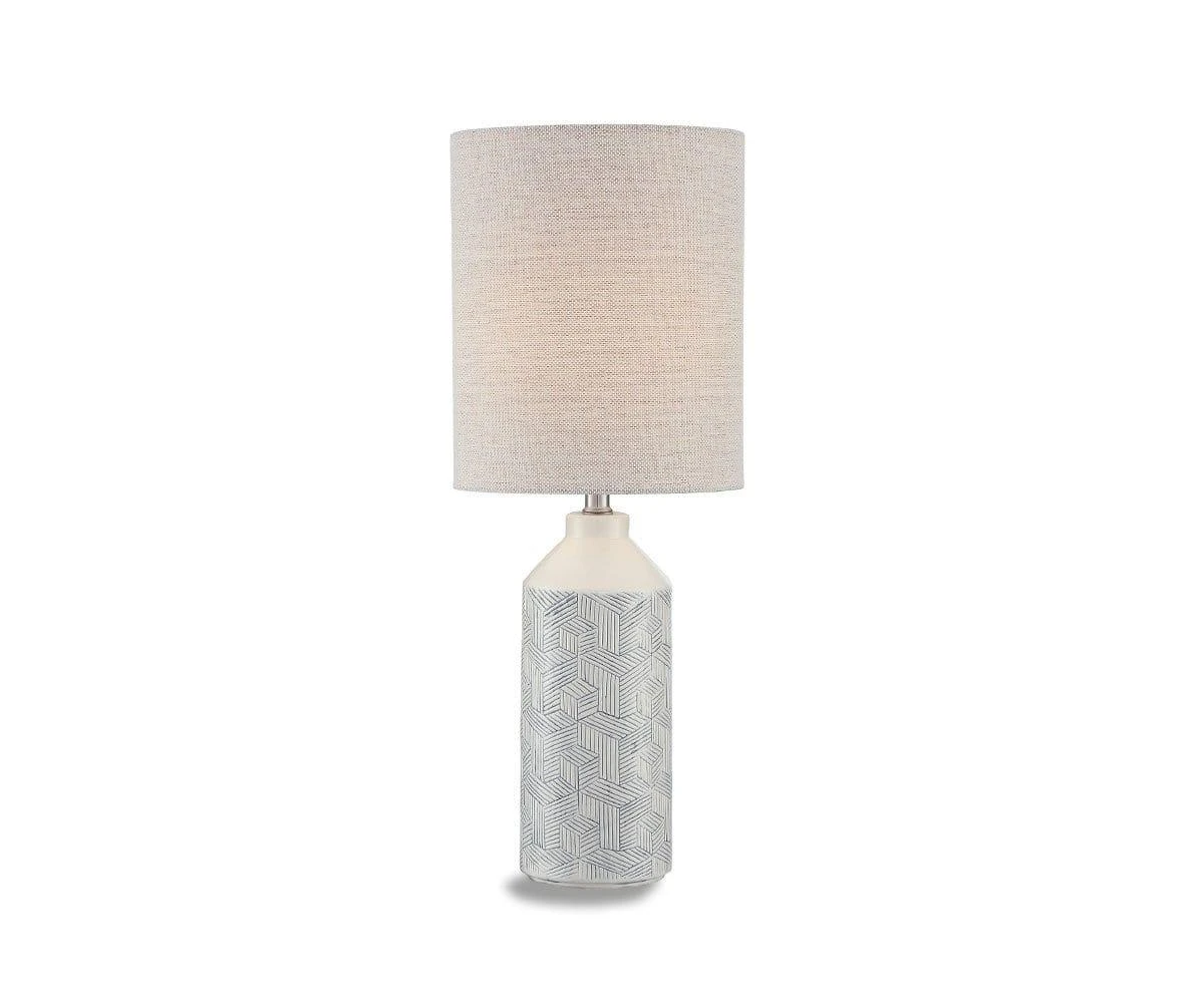 The Hatley Table Lamp brings an artistic twist to a classic silhouette. A ceramic base with subtle texture is lightly patterned with a geometric motif that brings dimension and an artisanal sensibility to this piece. Topped with a slim linen shade, this lamp easily fits into slender areas like a narrow nightstand or an accent table with a small, refined footprint. Use this lamp as a way to layer the lighting in your room, adding a sense of warmth to your space while illuminating your day-to-day with ease.