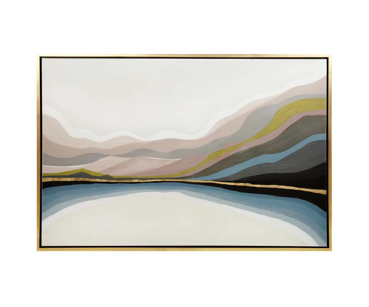 Fill your space with the soothing tones found in the Infinite Expanse Oil Painting. Depicting a serene body of water backed by cascading mountain peaks, this piece showcases a symphony of harmonizing hues. The pale tones of the jade-green water give way to deeper shadows that color the sapphire blue and emerald green hills. Pale pink and beige tones show off the sunlit mountain range, while the single streak of metallic shoreline punctuates this piece artistically. Hand-painted with 100% oil painting on canvas and finished with a gold frame, this contemporary piece is versatile by design, and can easily blend with any number of decor styles.