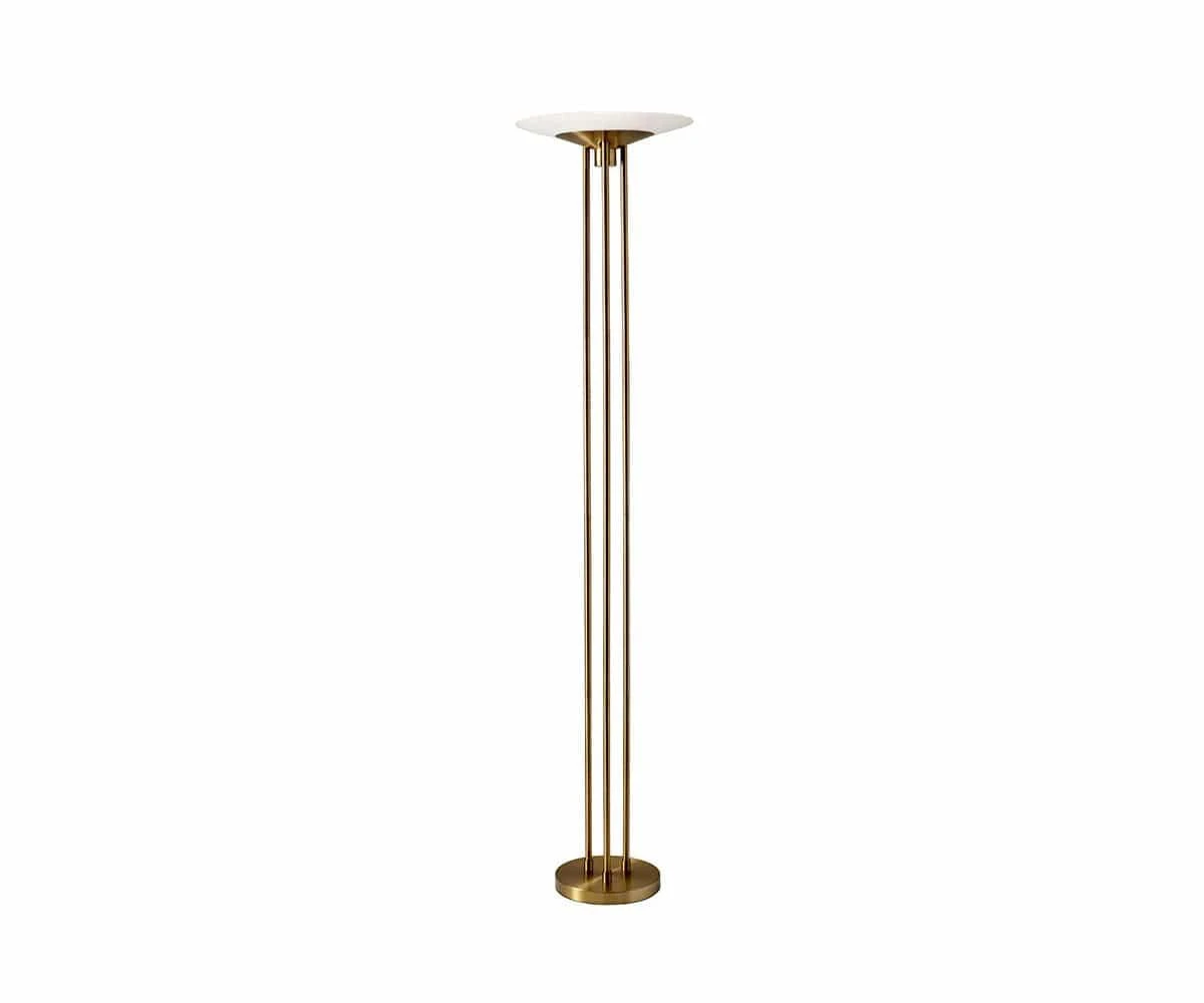 The Lilly Torchiere Floor Lamp makes a classically elegant addition to any space. The tall stem of this lamp is comprised of four slender metal poles which hold a shallow frosted glass shade aloft. A sturdy base anchors this piece, which stands ready to flood any space with soft, warm light.