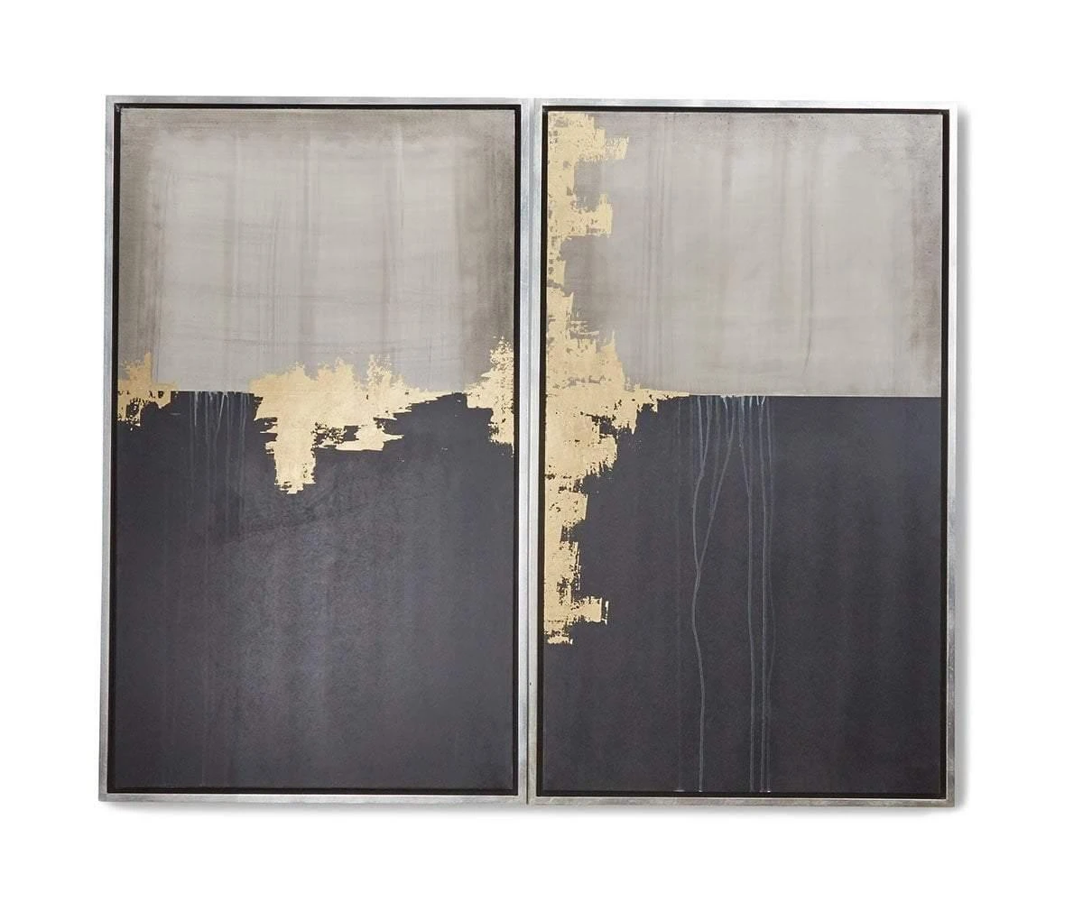 The Magnetic Composition Wall Art is a gorgeous set of two large canvases framed in wood with a silver finish. Splashes of gold leaf pop against the neutral backdrop of this abstract design and create the balance of warm and cool tones. Hung together, these two modern masterpieces make a true style statement in any room they adorn.