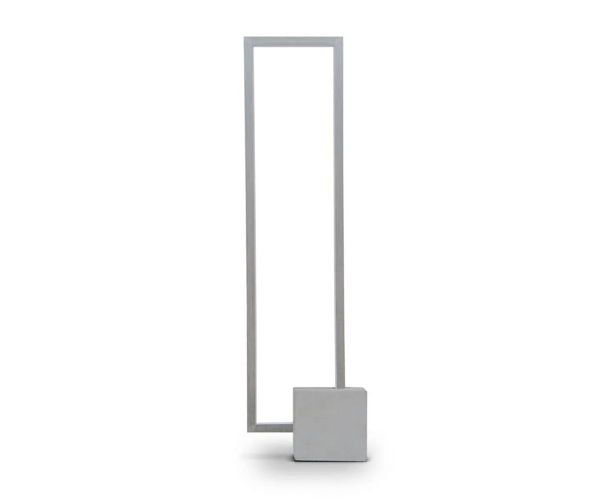 Modern minimalist design is illuminated with the Maltid Floor Lamp. A grey cement cube base artfully supports the rectangular aluminum frame.