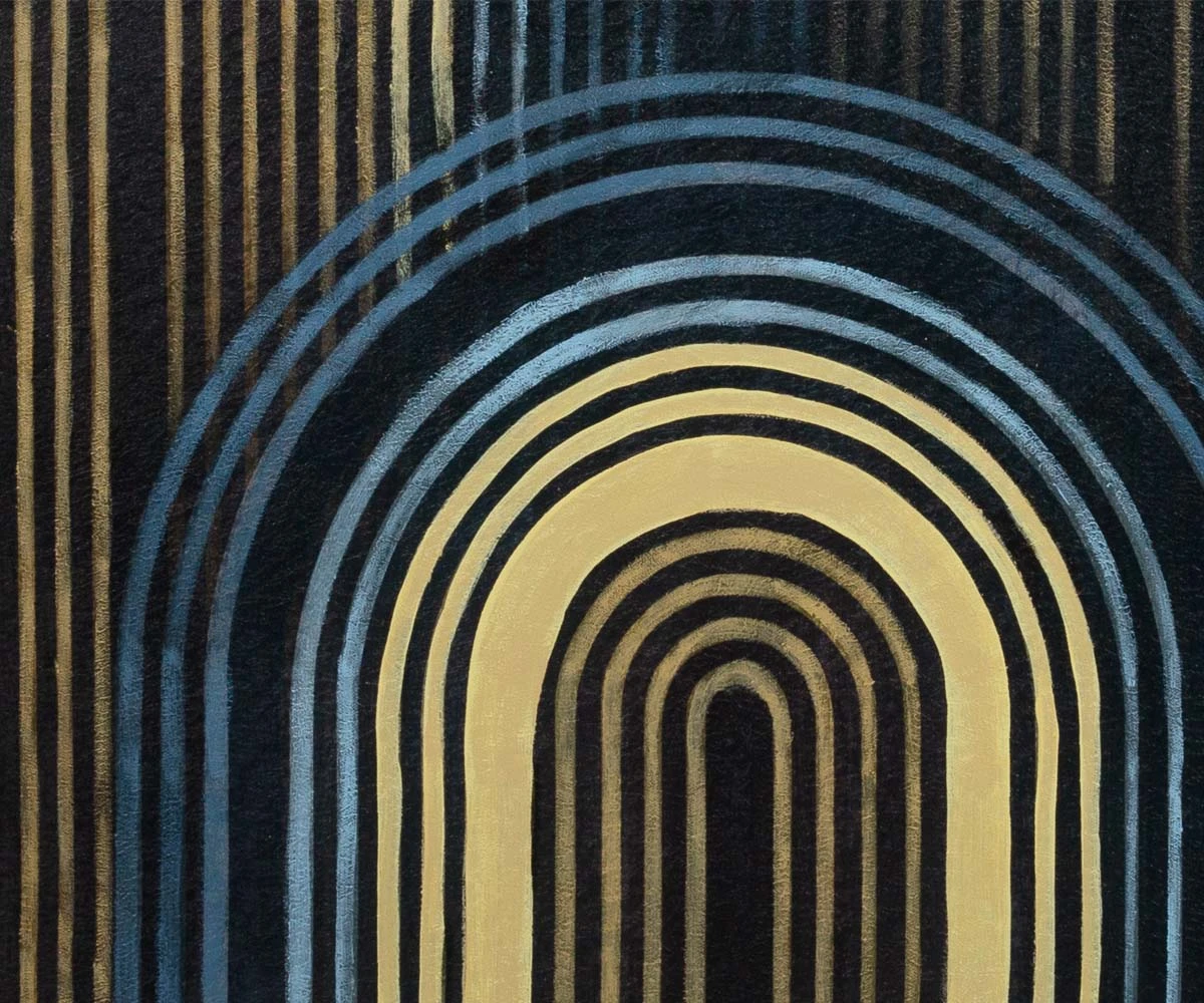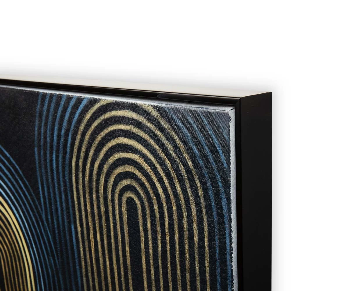 Anchor your aesthetic with the rich, dark hues of the Midnight I Oil Painting. Inspired by the vibrant contrasts and clean lines found in pop art, this piece showcases the inky curve of arches punctuated by bright lines that lend themselves to a dimensional, dynamic feeling. Hand-painted with 100% oil paint on canvas and set in a black frame, this modern piece pairs well with the Midnight II Oil Painting. Hang this duo on a wall together to create a gallery wall effect, or pair with the Midnight Mountain Oil Painting for a cohesive set of pieces that naturally infuse your space with a midnight motif. Midnight II Oil Painting and Midnight Mountain Oil Painting each sold separately.