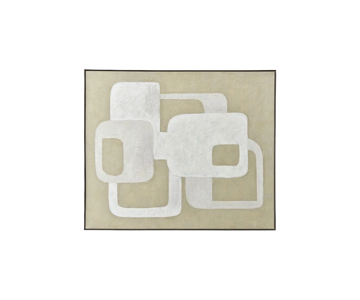 The Mod Contours Oil Painting features a bold mid-century print in a vintage palette. The use of neutral tan and cream-colored hues lend this piece an elevated, elegant feel, while the curving designs of the mid-century inspired shapes cement it as an homage to the design motifs that defined this beloved era. This large scale piece makes a statement, and can act as a mid-century touchstone for any space.