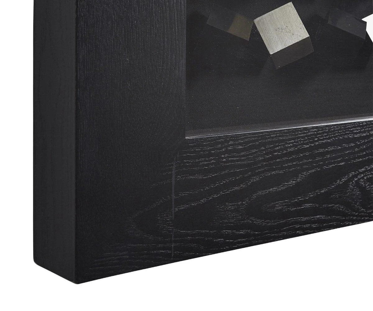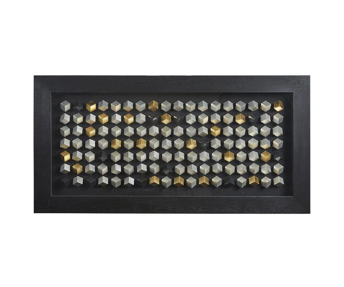 Cubist-inspired design meets an energetic modern aesthetic in the Paxtown Graphic. This decorative piece features a thick black frame surrounding rows of cubes that seem to dance in hues of satiny gold, silver, and inky black. Add this piece to your collection and enjoy the multi-dimensional charisma of this dynamic piece of art.
