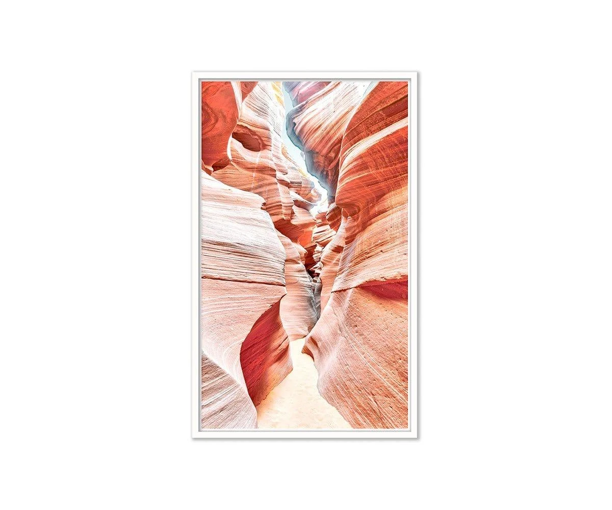Step into the depths of the Remote Realm, and find yourself transported within one of Mother Nature’s wonders. Striated rocks in soft, muted tones ebb and flow around a pathway that leads towards caverns unknown. Display this piece in your home to evoke thoughts of wonder, mystery and adventure.