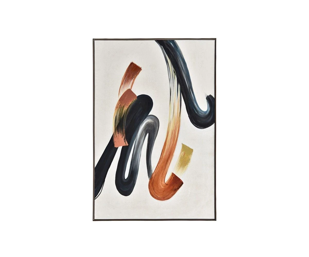 The bright Ribbon II Oil Painting showcases a winding swathe of colors; mid-century hues ranging from yellow and cream to vivid blue and sienna orange evoke thoughts of a silk ribbon twisting in the breeze. Both minimalistic and eye-catching in its design, this oil painting naturally breathes life and dynamic movement into any space.