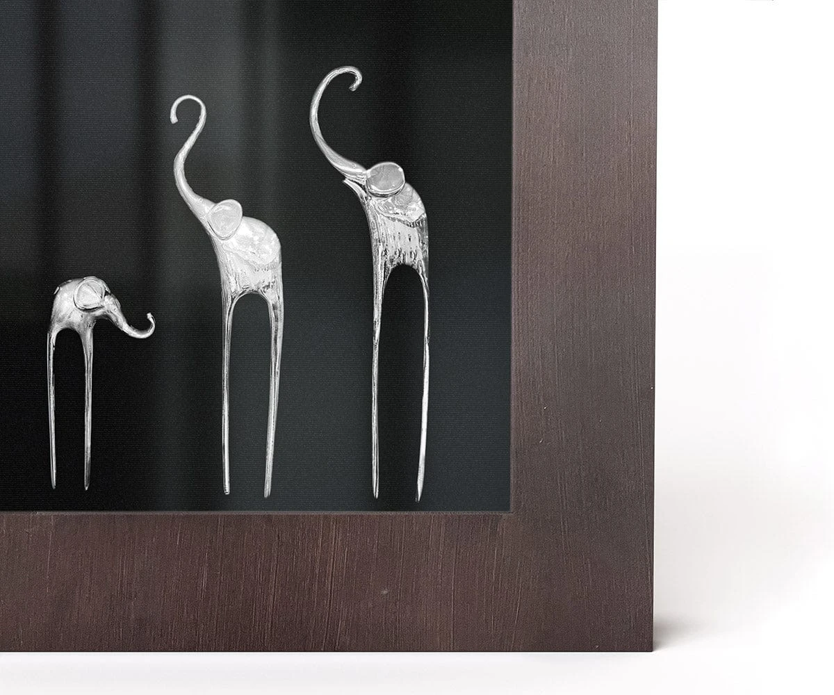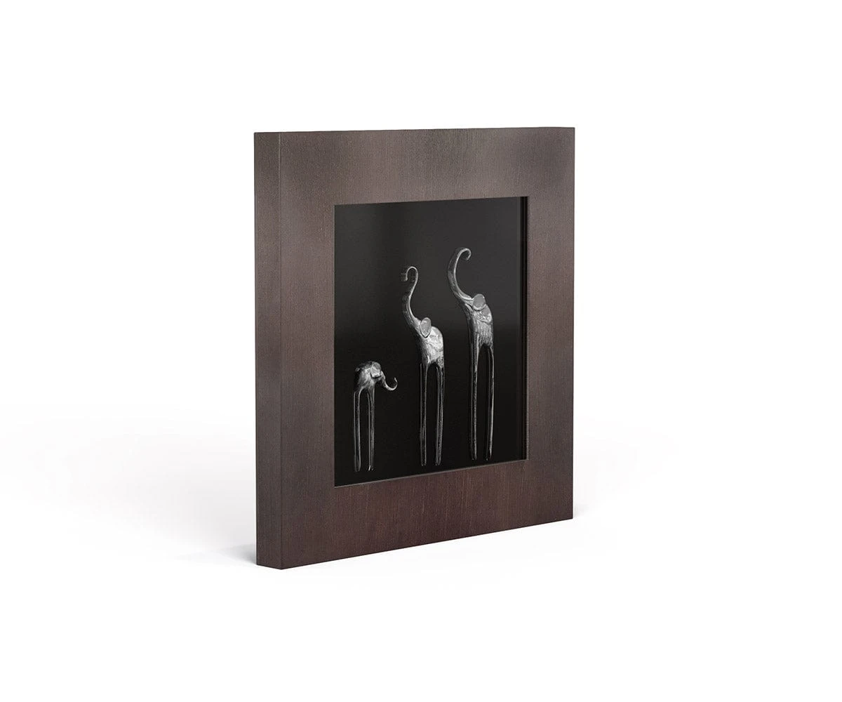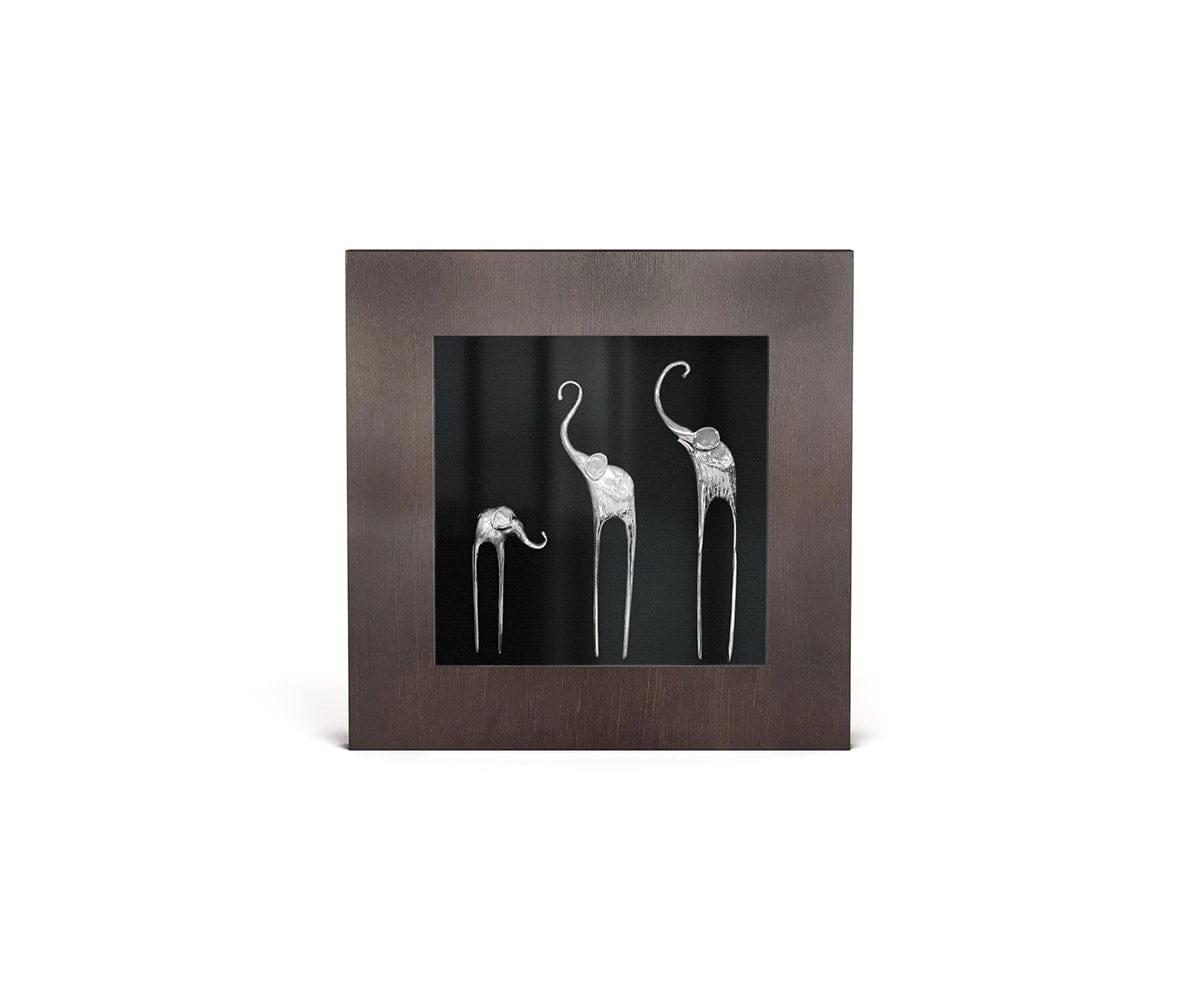 Three whimsical elephants play in the Samnaum II Elephant Graphic. Add this piece to your space for a touch of sophisticated charm, and enjoy the striking three-dimensional effect created by the contrast between metal elephants and brown shadow box. Hang this artwork on its own or create a harmonious collection with the coordinating