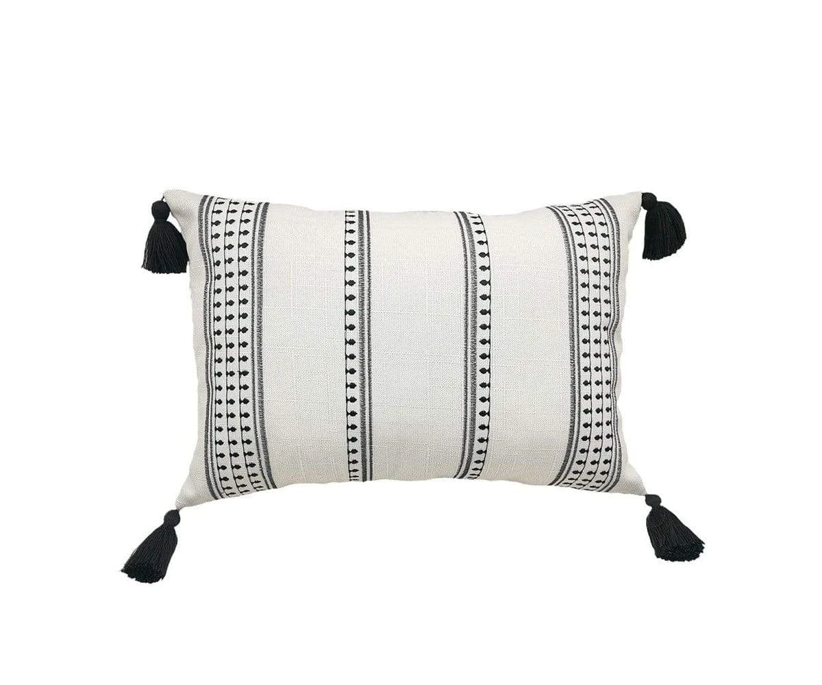 The Textured Stripes Pillow adds an airy sense of light, contemporary style to any space. Featuring embroidered black stripes on a neutral linen background, this pillow combines the textures of detailed embroidery with those of the supple linen in a uniquely lovely way. Layer this pillow with other throw pillows to complete your modern decor in style – this piece effortlessly brings both texture and dimension to any sofa, accent chair or bed where it is placed. Completed by an invisible zipper closure and a set of breezy tassels, this pillow is an incredibly versatile accent to add to any room. Made of a poly-linen blend, this pillow offers the durability of polyester while retaining the luxurious feel of linen. Note: pillow insert is sold separately.