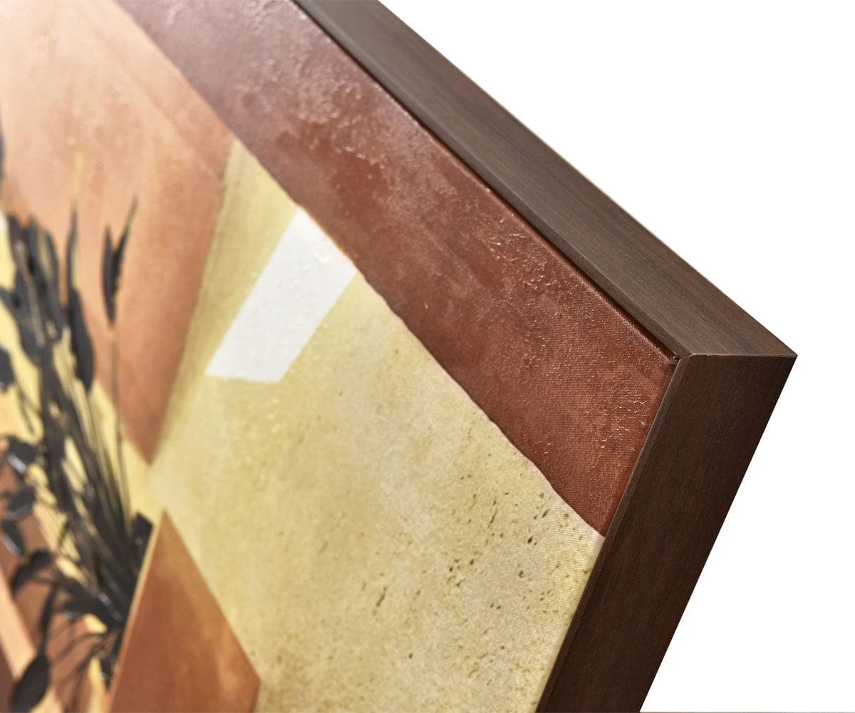 The Villa Portico Wall Art is a brightly-hued art print that has been enhanced with expertly hand-painted details. The minimalistic style and rich coloration of this unique piece is inspired by deserts in faraway lands; from the textured terracotta walls to the lone plant silhouetted against buttery pools of golden sunshine, this piece of wall art seems to breathe warmth and light. Add this piece to your space to permeate your room with mid-century colors, contemporary composition and striking style.