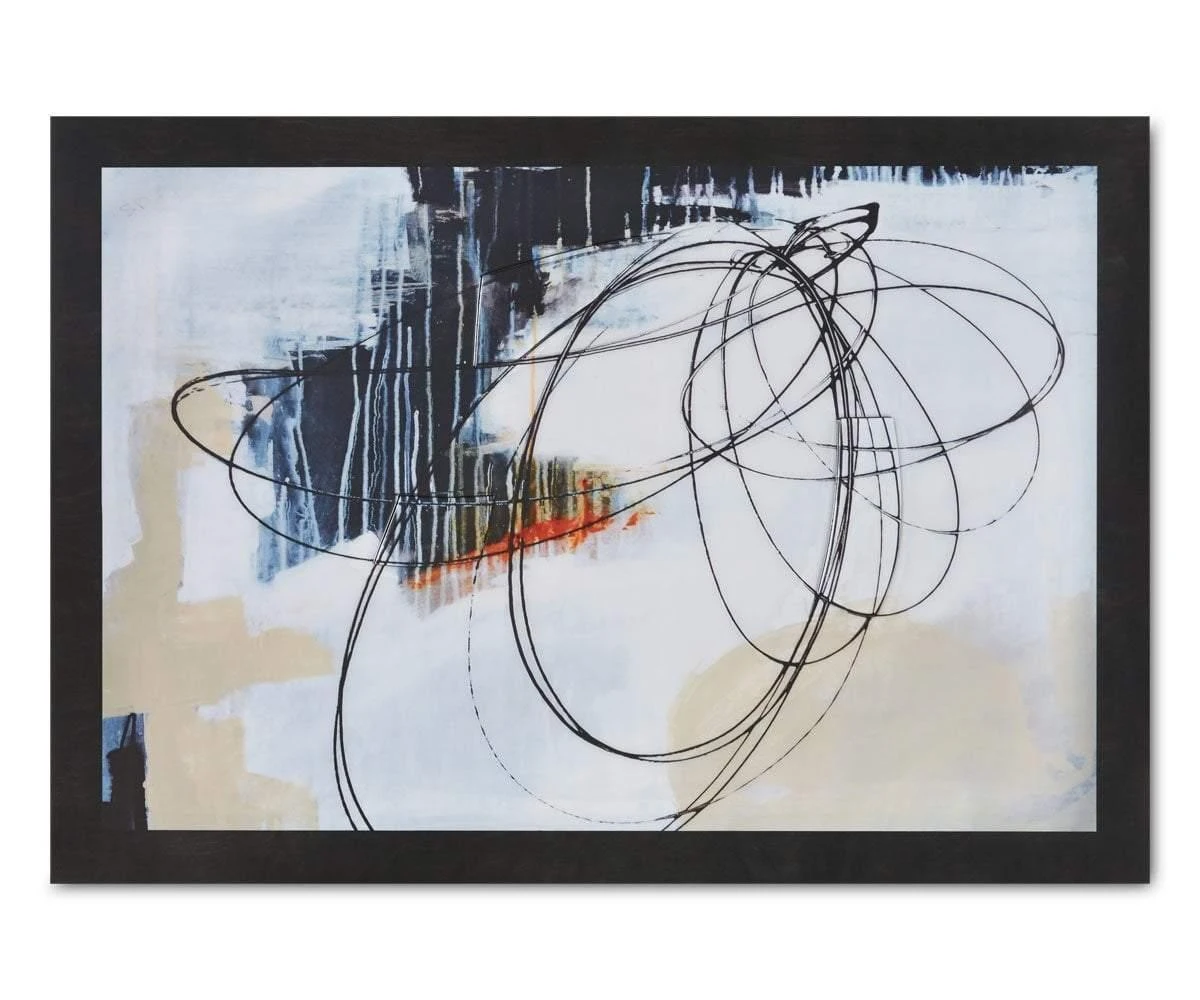 Sit back and relax while contemplating the vibrant splashes of color and soothing neutral background of the Wisps Over Neutrals Abstract. The impressive size of this modern contemporary piece draws the eye easily from across the room. Framed in black to complete the stunning look, find the perfect wall to make your statement.